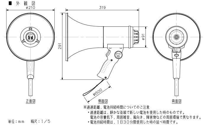 メガホンの電池持続時間は、従来JEITA規格で規定された赤マンガン乾電池での測定でしたが、規格の改定により黒マンガン乾電池での測定へ変更となりました。使用する乾電池の変更に伴い、電池持続時間の表示は従来より長くなります。